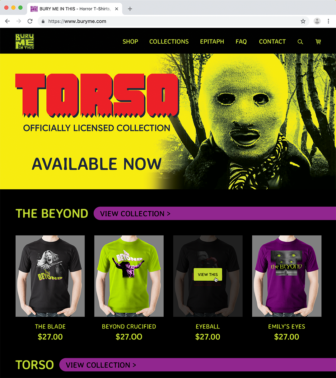 Bury Me In This is an apparel company born from the passion for horror, a large and historically longstanding genre of film reflecting the fears of the time in which it was created. Specifically, Bury Me In This focuses on obscure, cult and foreign films and franchises previously unlicensed by successful competitors. The apparel line caters to fans of this genre who want to share in their morbid fascination and expression through fashion. The graphics are designed to be conversation starters, building connection and curiosity from onlookers.